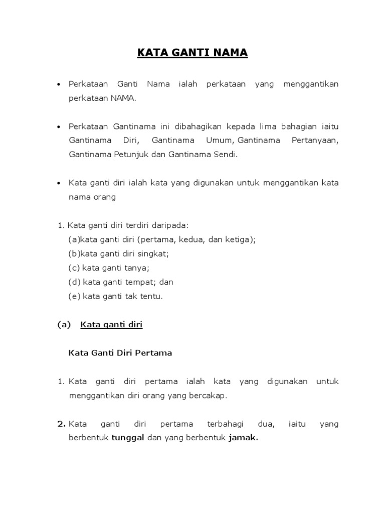 Kata yang digunakan untuk menggantikan nama manusia. Kata ganti berfungsi untuk efisiensi dan efektifitas pada kalimat di dalam wacana atau paragraf. () murid tahun tiga ,kata mei hooi dan soon keat. Dalam tatabahasa bahasa melayu, kata ganti diri ialah kata yang digunakan untuk menggantikan kata nama orang. Pdpr bm tahun 2 kata ganti nama diri.